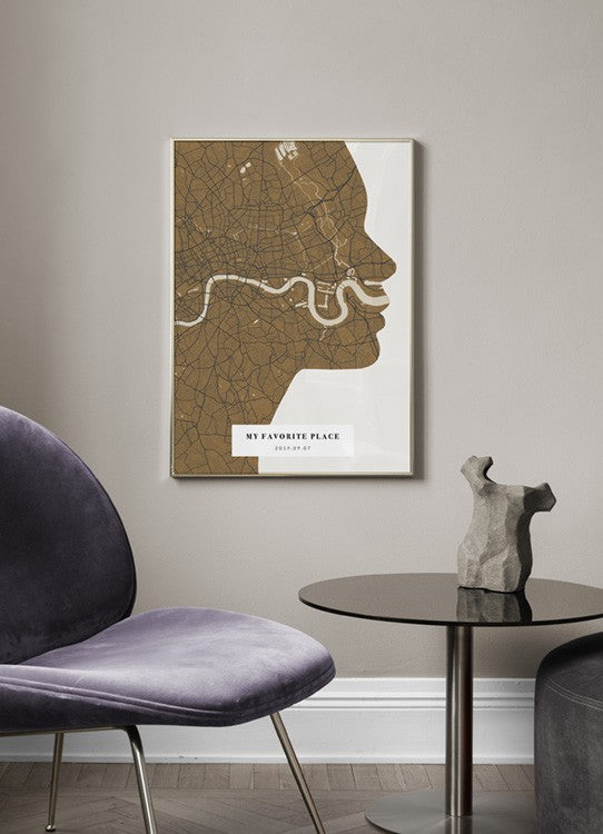 - City map shaped like a face silhouette in brown and beige with text at the bottom Brown and beige city map in the shape of a face silhouette on a light grey background with text at the bottom. Personalised prints allow you to customise your very own print, either by adding your own text, names or dates. It's both a fun way to personalise your own art or to give as a gift to someone else. Printed to order. Please note that it is not possible to return a personalised poster.