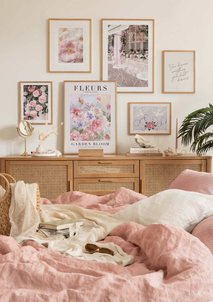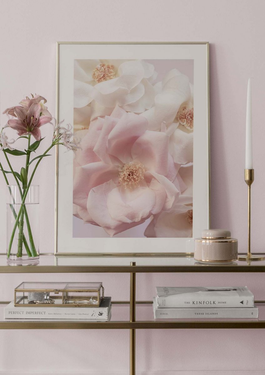 Photograph of roses in pink and white. Flowers bring a calm and welcoming feel, the perfect wall art to add to the home decor. The poster has a printed white margin that frames the design.