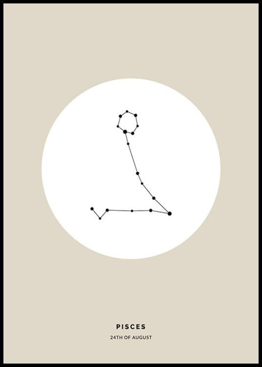 - Illustration of the zodiac sign for Pisces in black in a white circle on a beige background Illustration of the Pisces zodiac sign in a white circle against a beige background with text at the bottom. Personalised prints allow you to customise your own print and make it unique! Printed to order. Please note that it is not possible to return a personalised poster.