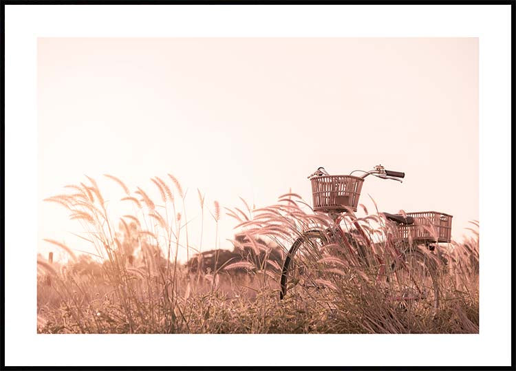 Photograph in a landscape format of a bike in the grass with the sunset in the background. This wall art creates a serene and calm vibe in your home decor. Perfect to match with a romantic quote. The poster has a printed white margin that frames the design.