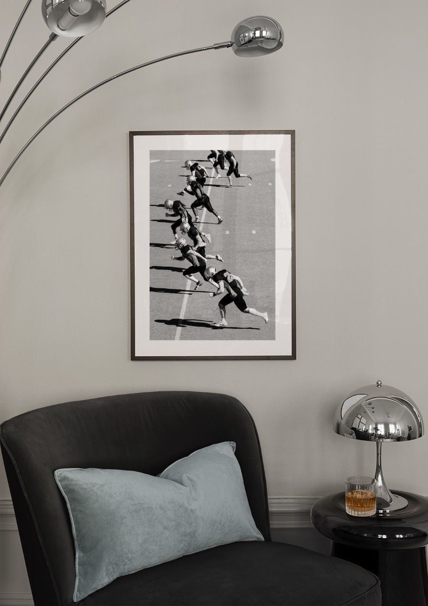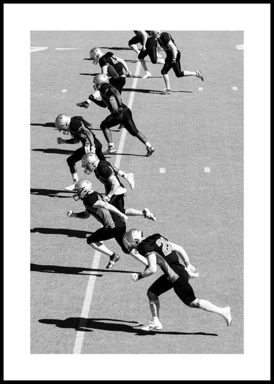 This dynamic black and white photograph captures a team of football players in the heart of their training. The shadows add depth to the composition and capture the essence of motion and athleticism. This poster is an ideal choice for sports enthusiasts and lovers of captivating photographic art. This art print has a grainy photo structure. This poster has a white margin to frame the design.