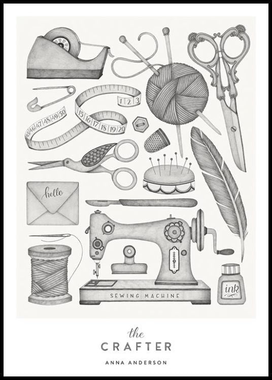 - Arts and crafts supplies sketched in grey with text at the bottom Illustration of sowing and crafts supplies in grey with text at the bottom. Personalised prints allow you to customise your very own print, either by adding your own text, names or dates. It's both a fun way to personalise your own art or to give as a gift to someone else. The poster is printed with a white border. Printed to order. Please note that it is not possible to return a personalised poster.