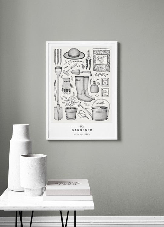 - Gardening tools drawn in grey with text at the bottom Illustration in grey-scale of gardening tools and text at the bottom. Personalised prints allow you to customise your very own print, either by adding your own text, names or dates. It's both a fun way to personalise your own art or to give as a gift to someone else. The poster is printed with a white border. Printed to order. Please note that it is not possible to return a personalised poster.
