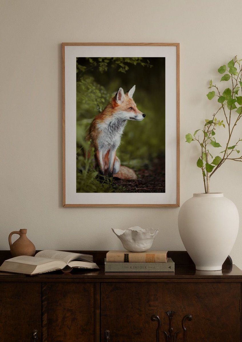 An illustration featuring a fox sitting among green leaves with a blurred background. The foxs red, white and black fur is shown in detail. This print has a white margin around the image to frame the design.
