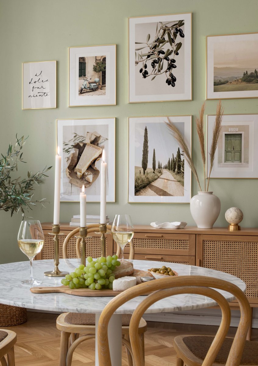 Photograph of a building with a green door and the sign Vini above. Perfect poster to add to a gallery wall along with other green and beige prints and quotes. This art print has a grainy photo structure. The poster has a printed white margin that frames the design.