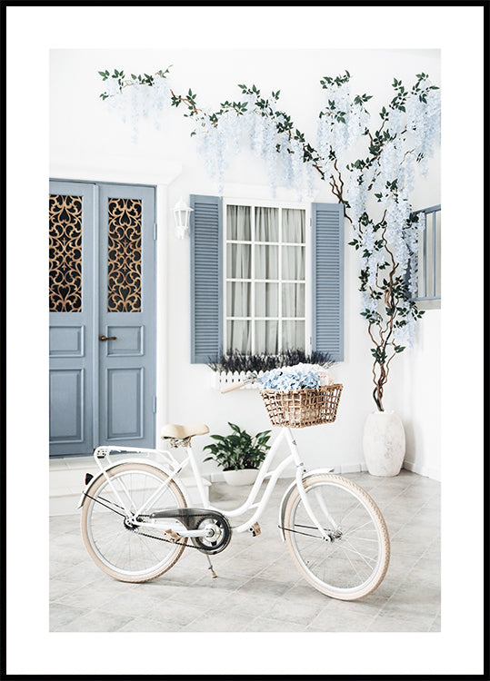 Photograph of a white bike standing outside a tropical white building with light blue doors together with a big plant in the corner. Create a romantic summer vibe in your home decor! The poster has a printed white margin that frames the design.