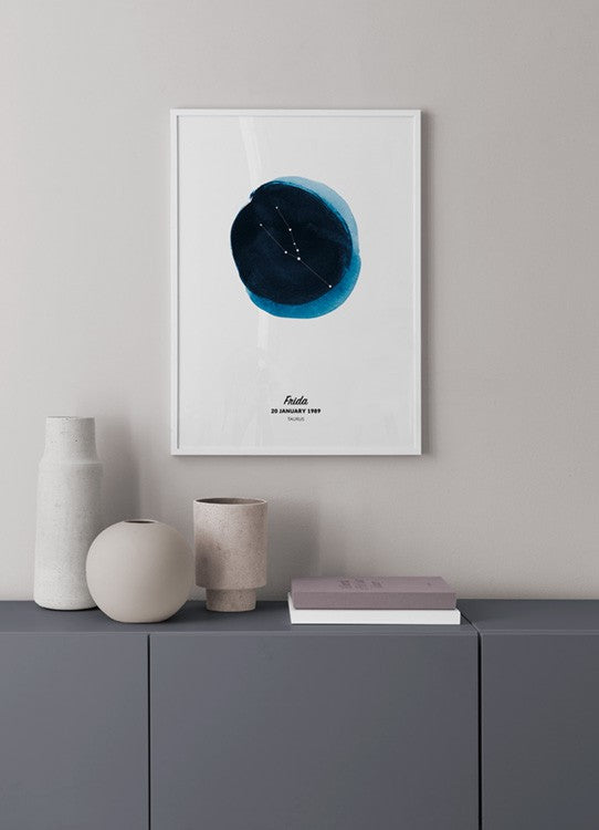 - Illustration of the Taurus sign in a circle painted in blue watercolour Illustration of a white Taurus sign in a blue circle painted in watercolour, against a white background with text at the bottom. Personalised prints allow you to customise your own print and make it unique! Printed to order. Please note that it is not possible to return a personalised poster.